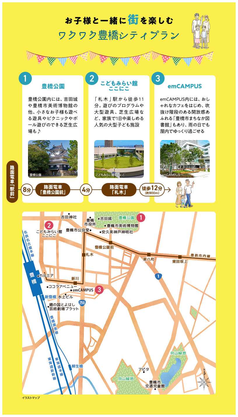 食・健康・学びを楽しみ、つながる、東三河の駅前の「笑む」に満ちたキャンパスとして、2021年に豊橋駅前に誕生した公共・商業複合型施設「emCAMPUS」。家族そろって気軽に参加しやすいイベントが毎月数多く開催され、豊橋市の新しいランドマークとして人気を誇っています