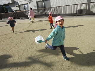 自分で作った凧で、凧揚げを楽しみました。寒さを吹き飛ばし夢中に走り回りました。「手を高く上げるといいよ!」「速く走るといいよ!」どうしたら高く上がるかな?