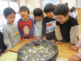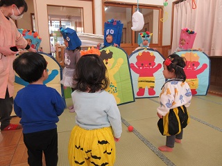 「おにはそと!」「ふくはうち!」鬼に向かって、新聞紙で作った豆を投げました。鬼を退治した後は、福の神からお菓子をもらって食べました!