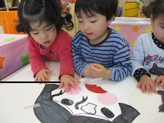 正月遊び。「鼻はどこかな?」「ここにしよ!」お友達とおしゃべりしながら、福笑いを楽しみました。色々な表情の面白い顔ができましたよ!