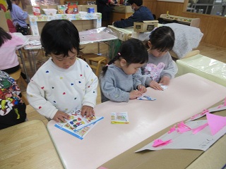 豆まき会に向けてお面づくりに真剣です。
