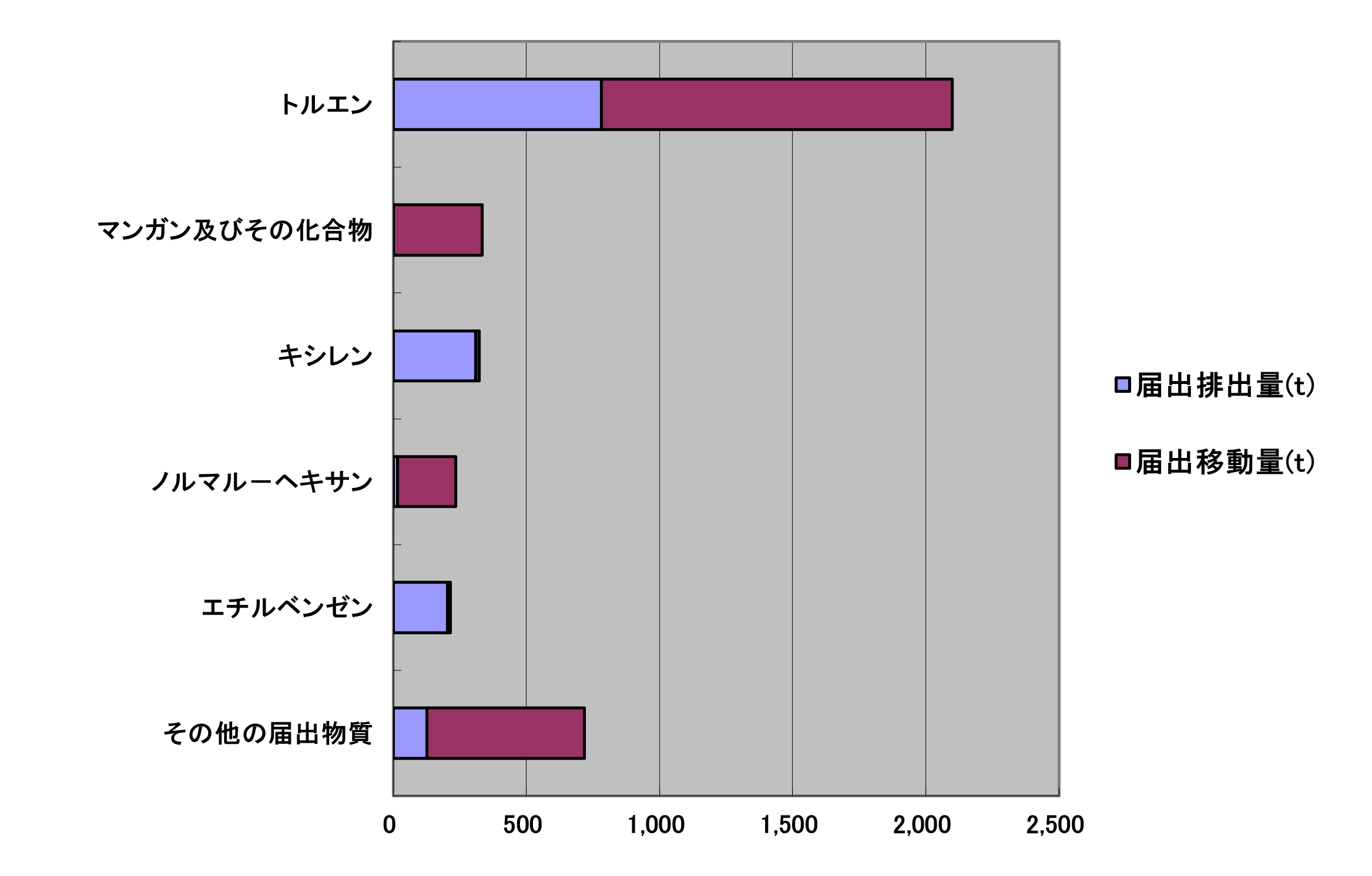 排出・移動量の合計は、約3,924tで、上位5物質は、トルエン、マンガン及びその化合物、キシレン、ノルマルヘキサン、エチルベンゼンの順で全体の約82%を占めています。