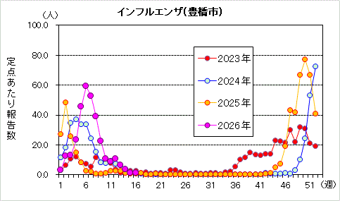 豊橋市ではインフルエンザについて市内の9医療機関(定点)から患者数の報告を受けています。