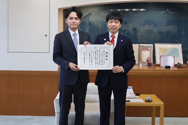 株式会社足立ライト工業所から豊橋市大学研究活動費補助事業のために、企業版ふるさと納税を活用し100万円の寄附をいただきました。4月24日(金曜日)に行われた感謝状贈呈式で、株式会社足立ライト工業所の田口勇樹総務課主幹は「豊橋市大学研究活動費補助事業を通じて学生の学び、ひいては豊橋市を応援したく、寄附をさせていただきました。」と話しました。