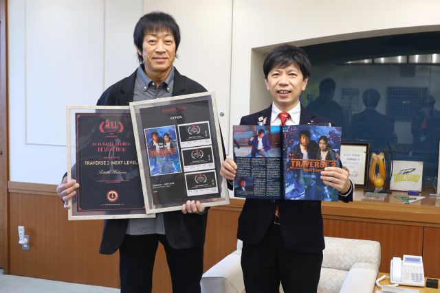 4月16日(木曜日)に、アクション映画「TRAVERSE 2 - Next Level - 」の主演であり、空手家の田部井淳さんが、作品の紹介とともに、海外の数々の映画祭で受賞している喜びを届けに、市長を表敬訪問しました。田部井さんは、撮影のすべてを豊橋市内で行ったことに触れ、感謝を示すとともに「自信をもってお届けできる作品です。」と話しました。市長は、様々な賞の受賞を祝福し、「豊橋の風景が多くの人に観てもらえることは嬉しい。」と、感謝の気持ちを伝えました。また、この映画は4月17日(金曜日)より、イオンシネマ豊川にて、ご鑑賞いただけます。
